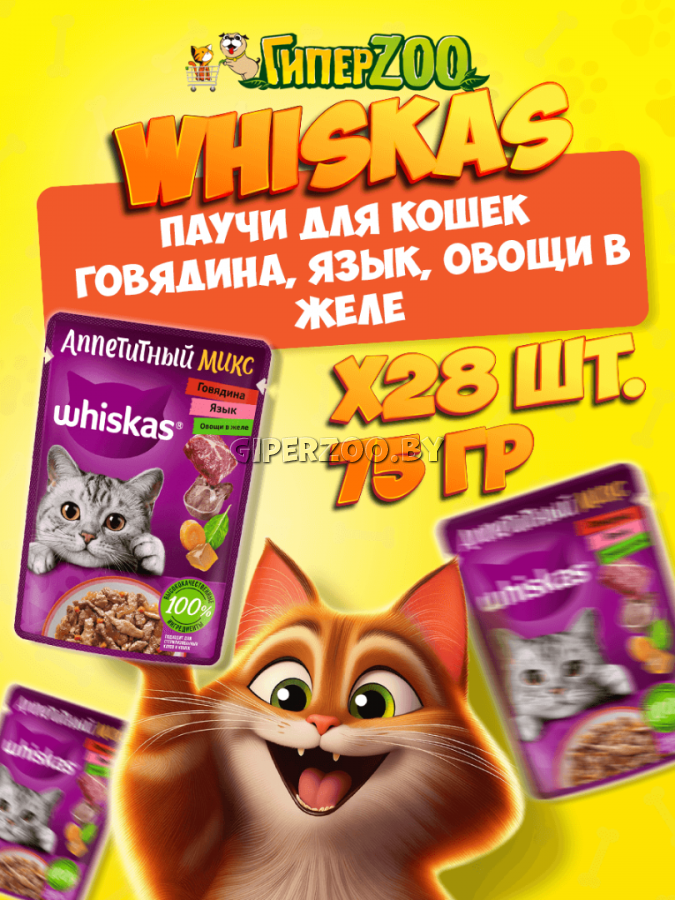 Влажный корм для кошек Whiskas Аппетитный микс (говядина, язык, овощи в желе) - сразу всё, о чём мечтала ваша кошка. В каждом из паучей содержится три основных ингредиента: разные виды мяса или морепродуктов смешиваются в нежнейшем соусе или желе, чтобы вы воплощали мечты своих любимцев. Подходит для стерилизованных котов и кошек.