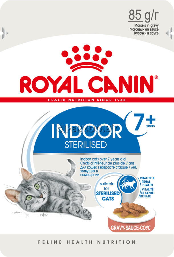 Royal Canin Indoor Sterilized +7 (соус) - это консервированный полнорационный корм для стареющих кошек (в возрасте от 7 до 12 лет), постоянно живущих в помещении, кусочки в соусе.