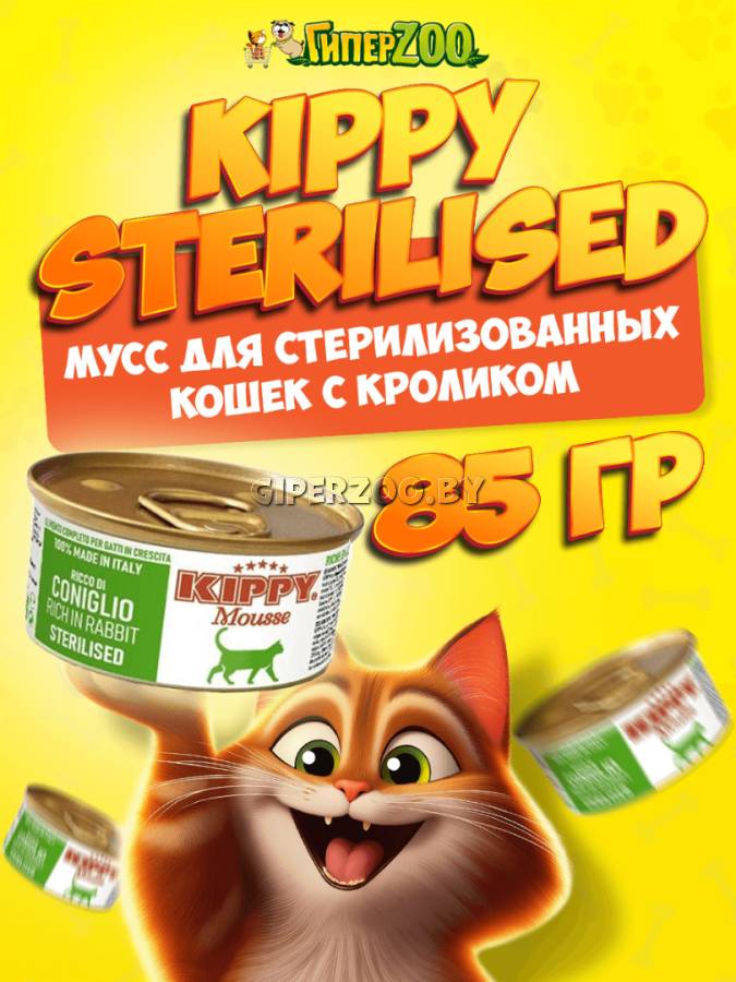 Консервированный корм Kippy Mousse Sterilised Cat мусс с кроликом, 85 гр - это нежный паштет из мяса кролика для взрослых кошек - прекрасное дополнение к основному рациону.