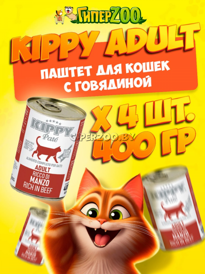 Влажный консервированный паштет Pate Cat Adult Beef 400 гр от Kippy подходит для взрослых котов всех пород.