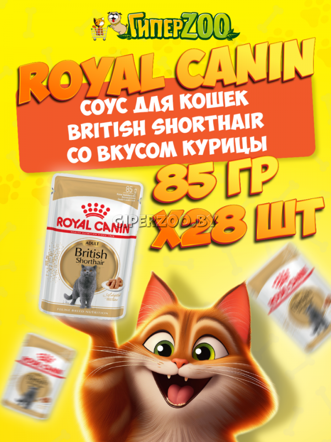 Royal Canin British Shorthair (в соусе), 85 гр*28 шт - влажный корм для британских короткошерстных кошек от 12 месяцев. Данная порода испытывает повышенную нагрузку на суставы, потому как имеет плотное и мощное телосложение. Корм содержит адаптированное количество жира, что гарантирует поддержание оптимального веса. Кошки особенно предрасположены к развитию сердечных заболеваний, поэтому диетическое, но от того не менее вкусное меню, обязательно понравится вашему питомцу. При регулярном употреблении влажного корма отмечается улучшение функционирования мочевыделительной системы, а также состояние кожи и шерсти. Состав: Мясо и мясные субпродукты, злаки, рыба и рыбные субпродукты, экстракты белков растительного происхождения, минеральные вещества, субпродукты растительного происхождения, масла и жиры, различные сахара.