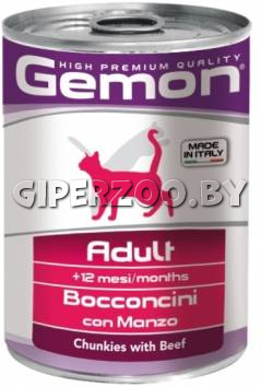 Консервы для котов Gemon Cat Adult Beef (Гемон Эдалт Биф), 415 гр — полноценный, сбалансированный консервированный корм с кусочками телятины. Специально разработан для ежедневного кормления взрослых кошек с нормальной физической активностью в возрасте 1-10 лет.