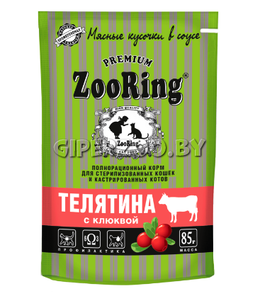 Полнорационный консервированный влажный корм ZooRing кусочки в соусе для взрослых кастрированный котов и стерилизованных кошек с телятиной и клюквой.