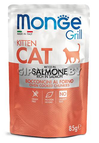 Monge Cat Grill Pouch Kitten Salmon - это ароматные рыбные кусочки в желе для котят. Основой рациона являются кусочки свежайшего норвежского лосося, приготовленного на гриле с добавлением овощей, выращенных в экологически чистых районах солнечной Италии, а также витаминов и минералов. Омега-3 и омега-6 жирные кислоты для красоты шерсти и здоровья кожи. Оптимальный баланс омега-3 и омега-6 в составе корма чрезвычайно важен для поддержания кожи и шерсти в отличном состоянии. DHA-кислота помогает правильному развитию головного мозга котенка. Витамин D3 обеспечивает прочность костей скелета у растущих котят. Grain free formula - не содержит зерновых культур.