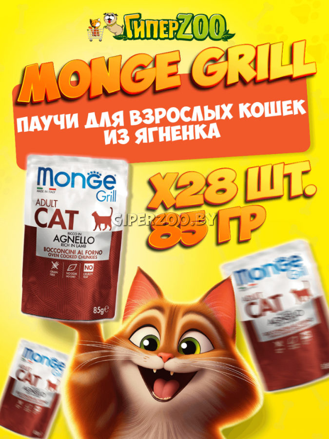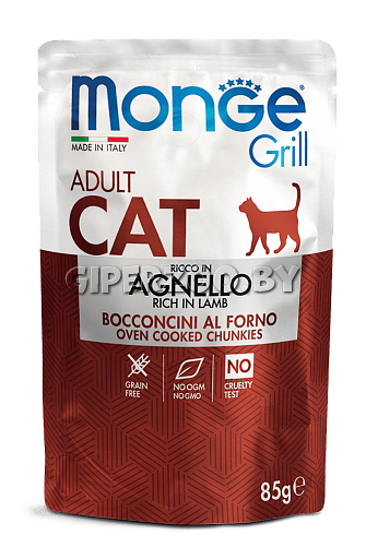 Monge Cat Grill Pouch Lamb - это консервированный корм для котов с кусочками ягненка в желе. Кусочки в желе характеризуются твердой текстурой и приятным ароматом, характерным для вареного мяса. Новозеландский ягненок, основной источник животного белка, является деликатным и характеризуется высокой пищевой ценностью и эффективен для улучшения пищеварения в кишечнике. Масло лосося богато омега-3 жирными кислотами, что благотворно влияет на блеск кожи и шерсти. Grain free formula - не содержит зерновых культур.