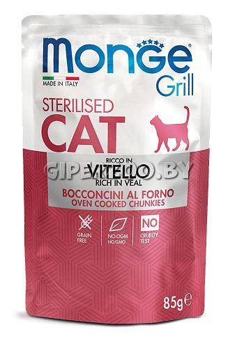 Monge Cat Grill Pouch Adult Sterilised Veal- это консервированный корм для кошек с кусочками телятины в желе. Новая линейка влажных рационов MONGE GRILL CAT разработана с учётом физиологических потребностей кошек. Омега-3 и омега-6 жирные кислоты для красоты шерсти и здоровья кожи. Оптимальный баланс омега-3 и омега-6 в составе корма чрезвычайно важен для поддержания кожи и шерсти в отличном состоянии. Рацион содержит важнейшие антиоксиданты, такие как витамин Е, для поддержания иммунной системы. Grain free formula - не содержит зерновых культур.