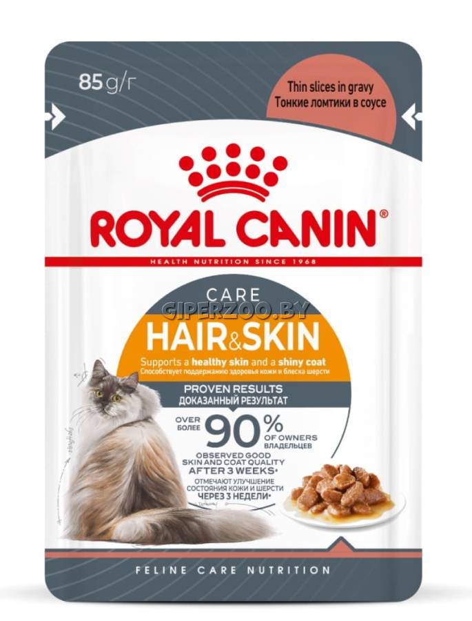 Royal Canin Hair&Skin Care, (соус), 85 гр*24 шт - Корм консервированный полнорационный для взрослых кошек (мелкие кусочки в соусе) Уходу за шерстью кошки приходится уделять особое внимание. Особенно это касается длинношерстных животных. Однако обеспечение кошки всеми необходимыми питательными веществами обязательно поможет кошке раскрыть потенциал красоты: шерсть станет более блестящей и шелковистой. Для продукта Royal Canin Hair&Skin Care в соусе характерно высокое содержание жирных кислот омега-3 и омега-6, способствующих блеску шерсти и здоровью кожи. Royal Canin Intense Beauty в соусе также помогает кошке поддерживать оптимальный вес благодаря низкому содержанию жиров и оптимальному уровню белков, способствующих сохранению и росту мышечной массы. Состав: мясо и мясные субпродукты, злаки, рыба и рыбные субпродукты, масла и жиры, субпродукты растительного происхождения, экстракты белков растительного происхождения, минеральные вещества, источники углеводов.