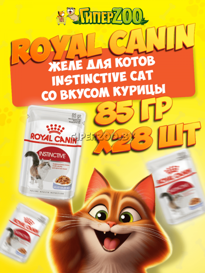 Корм консервированный полнорационный для взрослых кошек (мелкие кусочки в желе) Royal Canin Instinctive в желе разработан в соответствии с макронутриентным профилем, инстинктивно предпочитаемым взрослыми кошками. Тщательно отобранные ингредиенты обеспечивают высокую вкусовую привлекательность этого продукта. Благодаря включению в его состав необходимых витаминов, аминокислот и минеральных веществ продукт обеспечивает кошке высокоусвояемое и сбалансированное питание. Royal Canin Instinctive в желе содержит оптимальное количество калорий и обеспечивает длительное чувство насыщения благодаря сбалансированному соотношению белков и клетчатки. Состав: мясо и мясные субпродукты, экстракты белков растительного происхождения, субпродукты растительного происхождения, масла и жиры, минеральные вещества, источники углеводов.