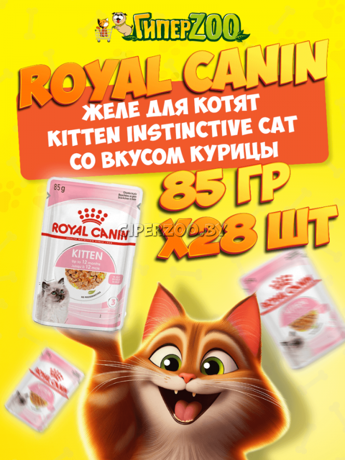 Royal Canin Kitten Instinctive (в желе) 85 гр - влажный корм для котят с 4 до 12 месяцев. Котенок во 2-й фазе продолжает расти, только рост происходит не так активно, как в 1-й фазе, поэтому он предпочитает специальную формулу Macro Nutritional Profile. При употреблении влажного корма укрепляется костная ткань котенка. Потребность в энергии остается высокой, хотя и несколько меньшей, чем у котят 1-й фазы роста, прорезаются постоянные зубы.Котенок 2-й фазы роста уже обладает собственной иммунной системой, однако его естественные защитные силы пока остаются уязвимыми. Корм Kitten Instinctive помогает формированию естественной защитной системы организма котенка, стимулируя выработку антител благодаря маннановым олигосахаридам и комплексу антиоксидантов (витаминам E и C, таурину и лютеину). Состав: Мясо и мясные субпродукты, злаки, экстракты белков растительного происхождения, субпродукты растительного происхождения, молоко и продукты его переработки, масла и жиры, минеральные вещества, дрожжи, углеводы.