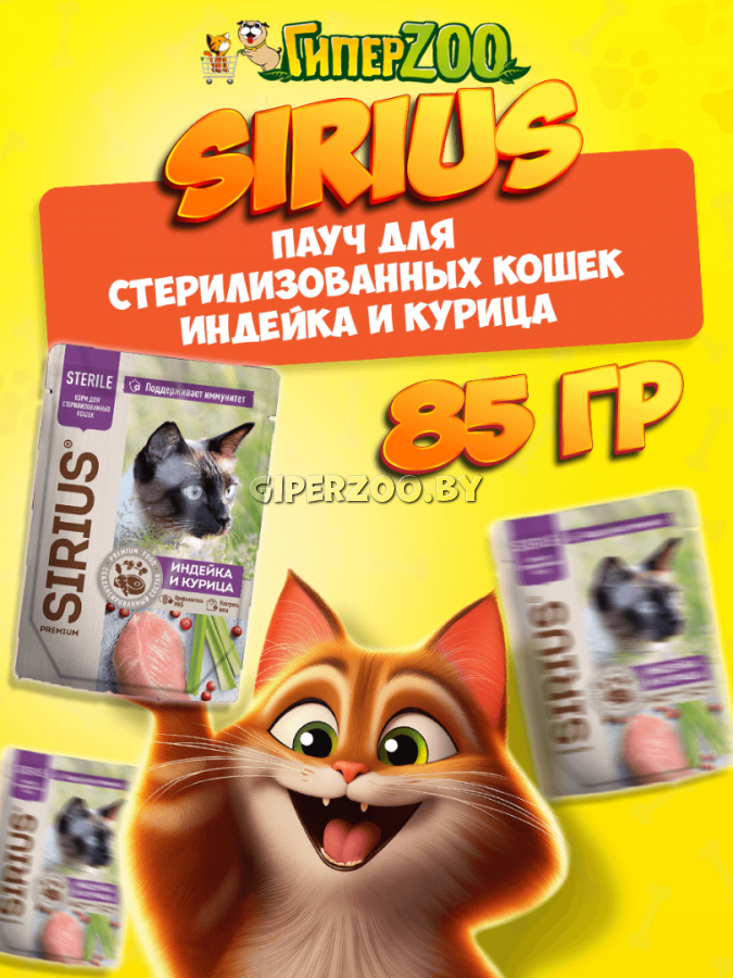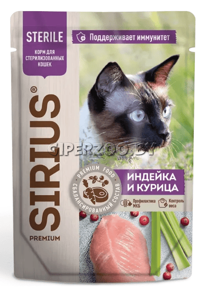 Sirius Консервы для кошек (Индейка, курица в соусе) — влажный корм для стерилизованных кошек.
