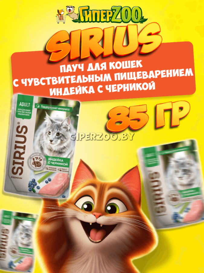 SIRIUS для кошек с чувствительным пищеварением (Индейка, черника) — сухой корм премиум класса для полноценного ежедневного питания взрослых кошек с чувствительным пищеварением.