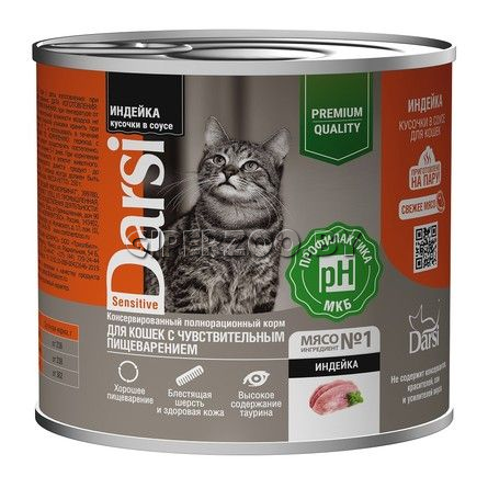 Darsi Sensitive Консервы для кошек (Индейка) - высокое содержание таурина - незаменимая аминокислота, которая важна для сохранения остроты зрения и поддержания правильной работы сердца. Устойчивый иммунитет Витамин Е и природные антиоксиданты повышают защитную функцию организма вашей кошки от неблагоприятного воздействия окружающей среды. Оптимальная мышечная масса Мясной и рыбный протеин с полноценным аминокислотным составом поддерживает мышцы. Профилактика МКБ Дополнительный источник влаги - Профилактика образования уролитов. Достаточное содержание аминокислот — слабокислый рН.