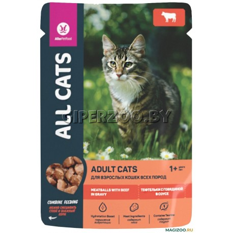 ALL CATS для кошек тефтельки (говядина в соусе), пауч, 85 г - это полнорационный премиальный корм для кошек всех пород. Он разработан на основе результатов последних исследований в области питания домашних животных, а также с учетом международных стандартов (AAFCO/FEDIAF).
