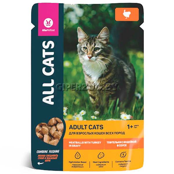 ALL CATS для кошек тефтельки (индейка в соусе), пауч, 85 г – это полнорационный премиальный корм для кошек всех пород. Он разработан на основе результатов последних исследований в области питания домашних животных, а также с учетом международных стандартов (AAFCO/FEDIAF).