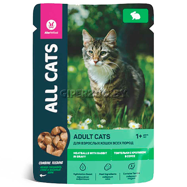 ALL CATS для кошек тефтельки (кролик в соусе), пауч, 85 г - это полнорационный премиальный корм для кошек всех пород. Он разработан на основе результатов последних исследований в области питания домашних животных, а также с учетом международных стандартов (AAFCO/FEDIAF).