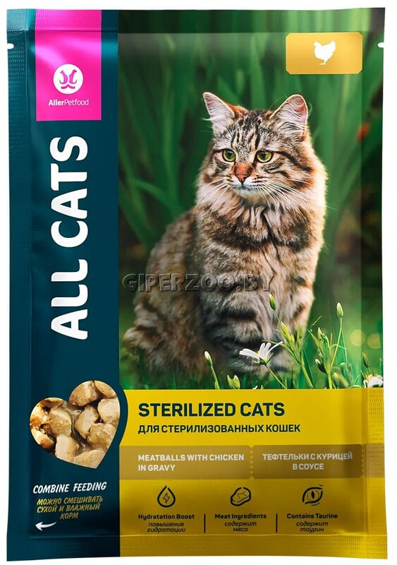 ALL CATS для стерилизованных кошек тефтельки (курица в соусе), пауч, 85 г - это полноценный премиальный корм для стерилизованных кошек и кастрированных котов всех пород. Он разработан на основе результатов последних исследований в области питания домашних животных, а также с учетом международных стандартов (AAFCO/FEDIAF).