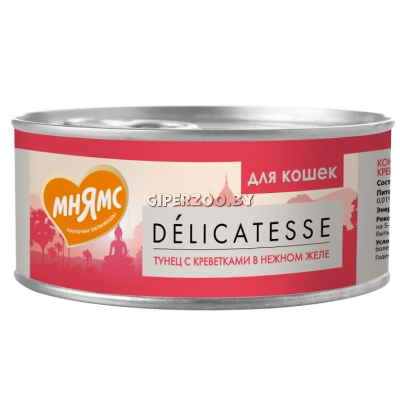 Консервы для кошек «Мнямс» состоят исключительно из отборных натуральных компонентов и не содержат сою, искусственные красители и усилители вкуса. В процессе производства консервов используется только отборное парное и охлажденное, а не замороженное сырье. Консервы на основе тунца изготовлены с добавлением креветок.