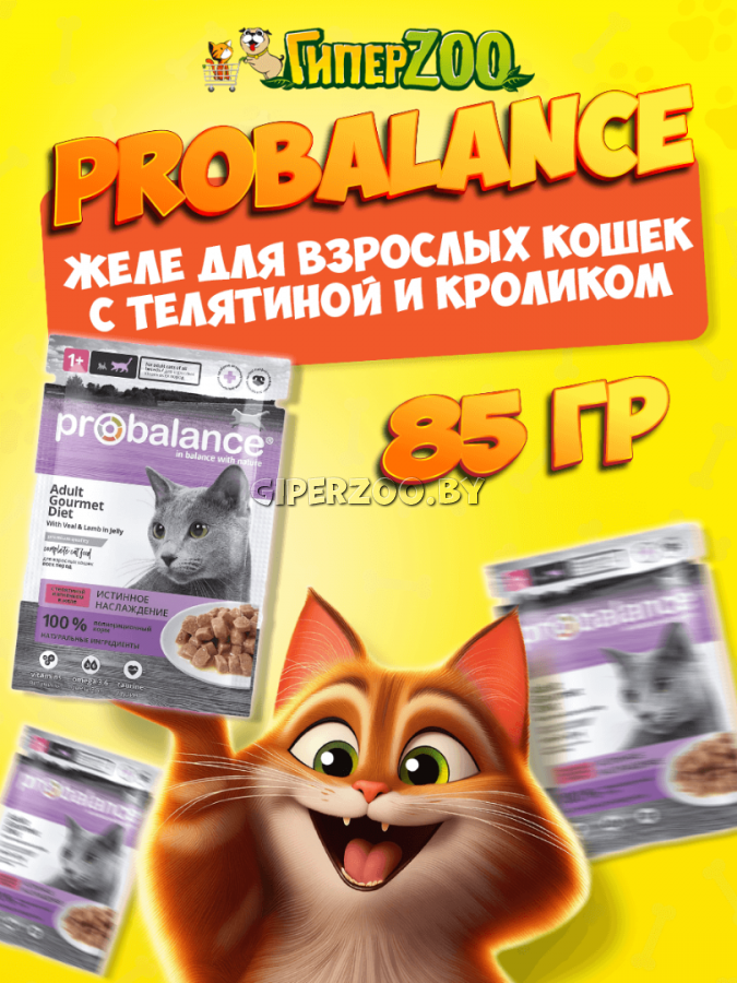 Влажный корм ProBalance Adult Gourmet Diet разработан специально для самых привередливых котов. Сбалансированное питание премиум класса станет здоровым ежедневным рационом Вашего питомца. Тщательно подбирая ингредиенты для корма, ветеринары достигли баланса вкуса и пользы. Питомцы полюбили Пробаланс за аппетитные мясные шарики и ароматную подливку. Состав: Мясо и мясные субпродукты (в т. ч. телятина не менее 4 %, кролик не менее 4 %), рыба и рыбные субпродукты, растительные компоненты, протеины животного происхождения,витаминно–минеральная добавка, пребиотик. Содержит таурин.