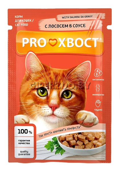Proхвост для кошек (Лосось в соусе) – полнорационный сбалансированный консервированный корм для кошек с лососем в соусе. Рацион подходит для ежедневного кормления взрослых кошек любых пород.