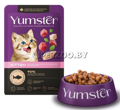 Гармоничное развитие маленького котёнка зависит прежде всего от правильного питания. Рецепты Yumster созданы с любовью экспертами-нутрициологами с учётом возрастных физиологических потребностей. Нежные мясные кусочки с рыбой в ароматном соусе – максимальное удовольствие и польза! Корм содержит фарш из свежей чёрной львинки. Это естественная и желанная пища маленького хищника, источник множества полезных аминокислот и микроэлементов. Ямстер – богатство выбора и натуральная польза для Вашего питомца!