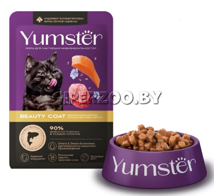 Домашние кошки в условиях городской квартиры испытывают недостаток активности и свежего воздуха, что может сказываться на их внешнем виде. Поэтому для здоровья кожи и шерсти питомца необходима витаминно-минеральная поддержка. Влажный корм Yumster Beauty Coat включает Омега-3 и Омега-6 растительного и животного происхождения, а также биотин, что способствует решению этой проблемы. Корм содержит также фарш из свежей чёрной львинки. Это естественная и желанная пища пушистого хищника, источник множества полезных аминокислот и микроэлементов.