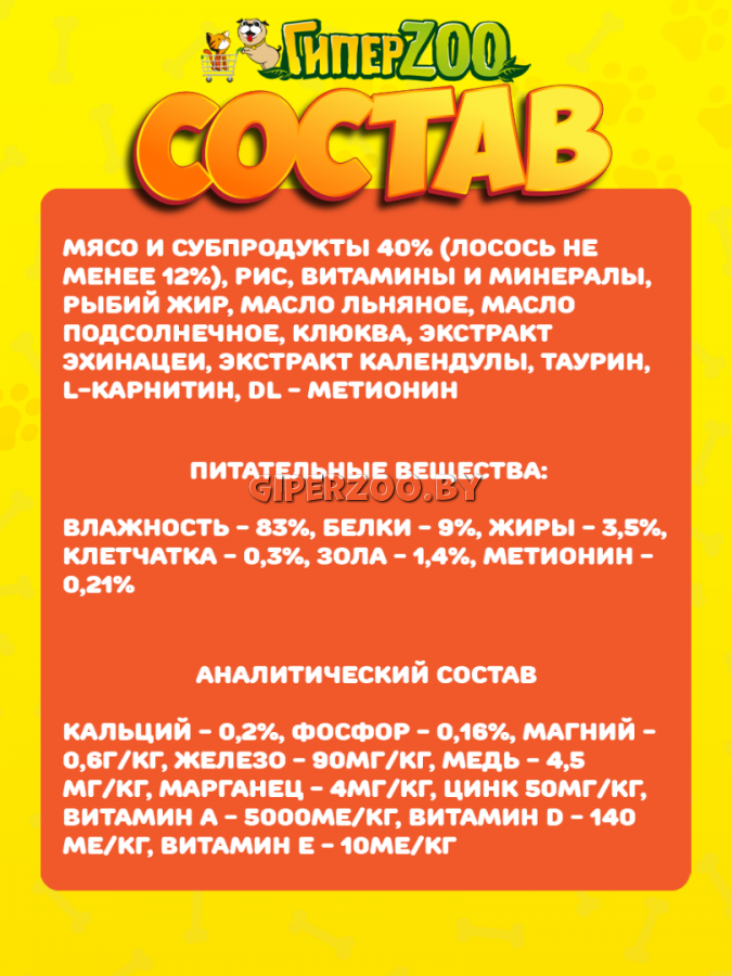 Мясо и мясные субпродукты 40% (лосось не менее 12%), рис, витамины и минералы, рыбий жир, масло льняное, масло подсолнечное, клюква, экстракт эхинацеи, экстракт календулы, таурин, L-карнитин, DL - метионин.