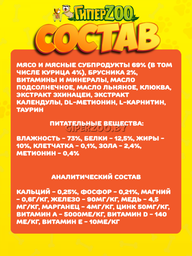 Для изготовления корма использовано отборное мясо и мясные субпродукты первой категории от проверенных поставщиков.