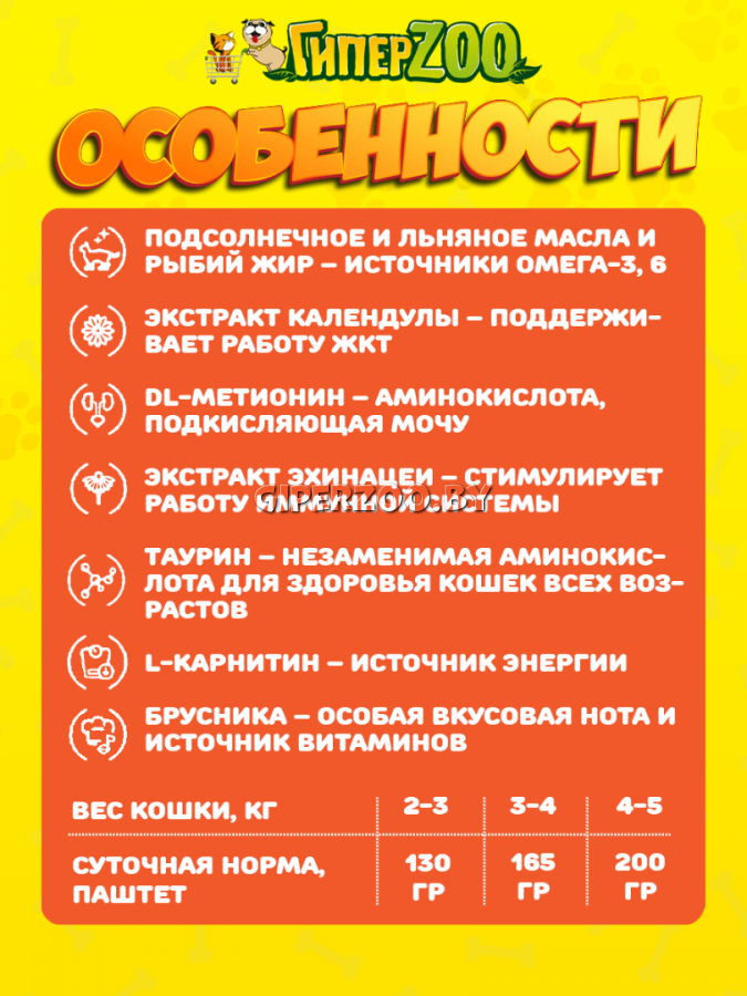 Рыбий жир, льняное и подсолнечное масло (источники Омега 3, 6 жирных кислот; линолевой кислоты) поддерживают здоровье кожи и красоту шерсти Экстракт календулы стимулирует работу ЖКТ Клюква, DL-метионин – регулирует кислотность мочи, профилактика МКБ Экстракт эхинацеи стимулирует работу иммунной системы Таурин – незаменимая аминокислота для здоровья кошек всех возрастов L-карнитин поддерживает оптимальный вес питомца Брусника – особая вкусовая нота и источник витаминов, антиоксидантов, микро- и макроэлементов.