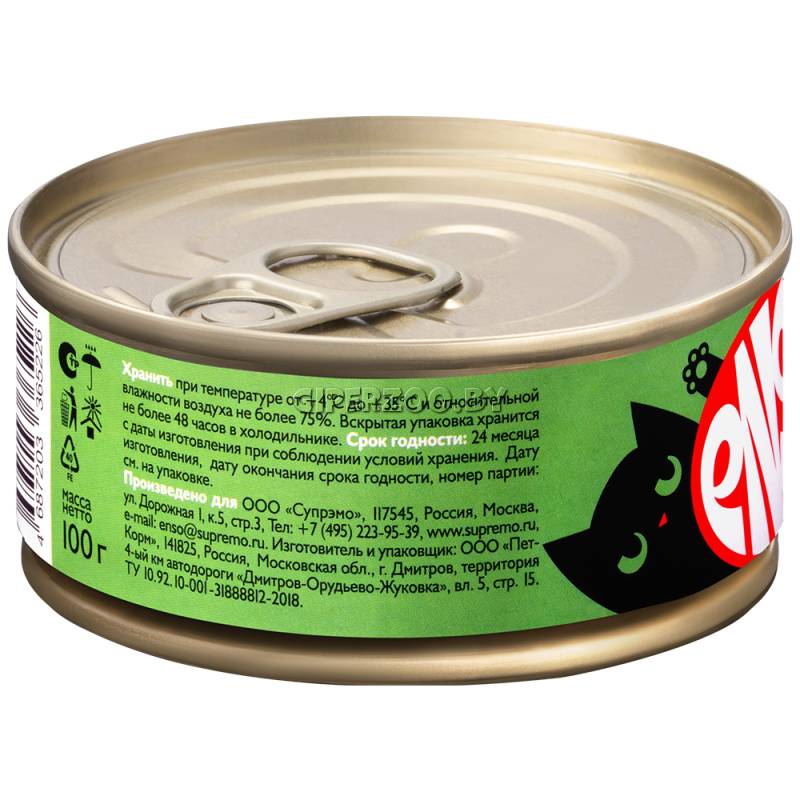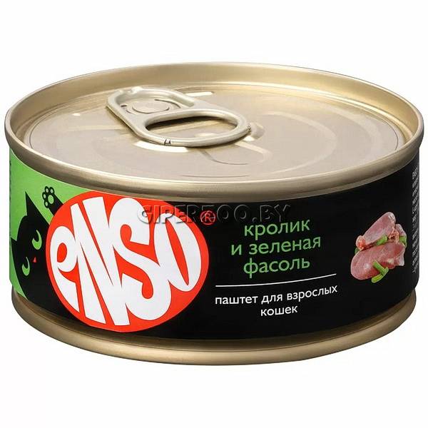 ENSO Консервы для кошек (Кролик, фасоль) — полнорационный корм для взрослых кошек, паштет с кроликом и зеленой фасолью.