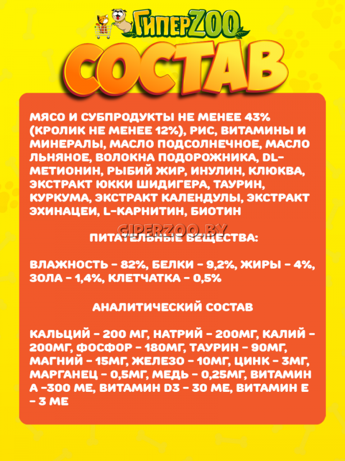 Мясо и субпродукты не менее 43% (кролик не менее 12%), рис, витамины и минералы, масло подсолнечное, масло льняное, волокна подорожника, DL-метионин, рыбий жир, инулин, клюква, экстракт юкки Шидигера, таурин, куркума, экстракт календулы, экстракт эхинацеи, L-карнитин, биотин.