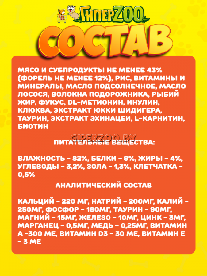 Мясо и субпродукты не менее 43% (форель не менее 12%), рис, витамины и минералы, масло подсолнечное, масло лосося, волокна подорожника, рыбий жир, фукус, DL-метионин, инулин, клюква, экстракт юкки Шидигера, таурин, экстракт эхинацеи, L-карнитин, биотин.