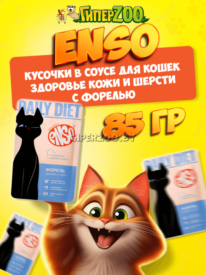 ENSO DAILY DIET Полнорационный влажный профилактический корм для взрослых кошек для поддержания здоровья кожи и красоты шерсти, кусочки с форелью в соусе.