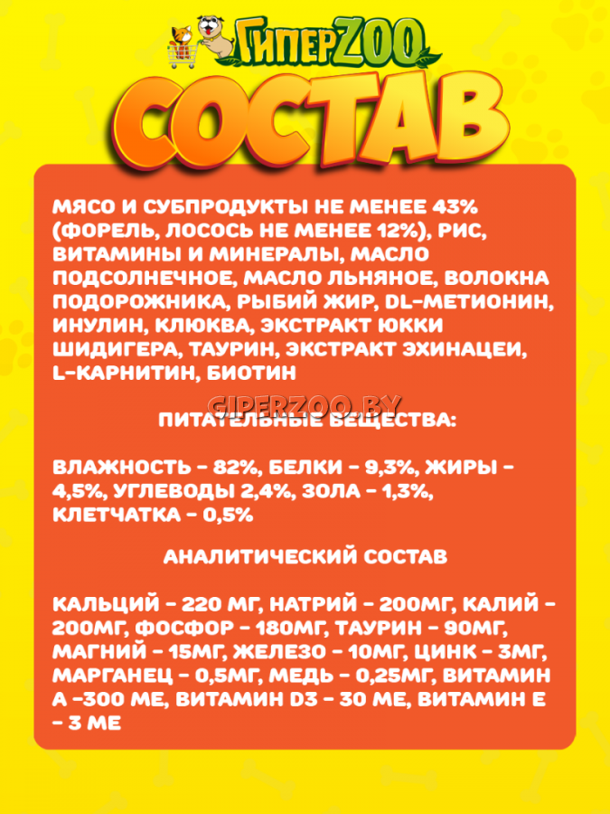 Кальций - 220 мг, Натрий - 200мг, Калий - 200мг, Фосфор - 180мг, Таурин - 90мг, Магний - 15мг, Железо - 10мг, Цинк - 3мг, Марганец - 0,5мг, Медь - 0,25мг, Витамин А -300 МЕ, Витамин D3 - 30 МЕ, Витамин Е - 3 МЕ.