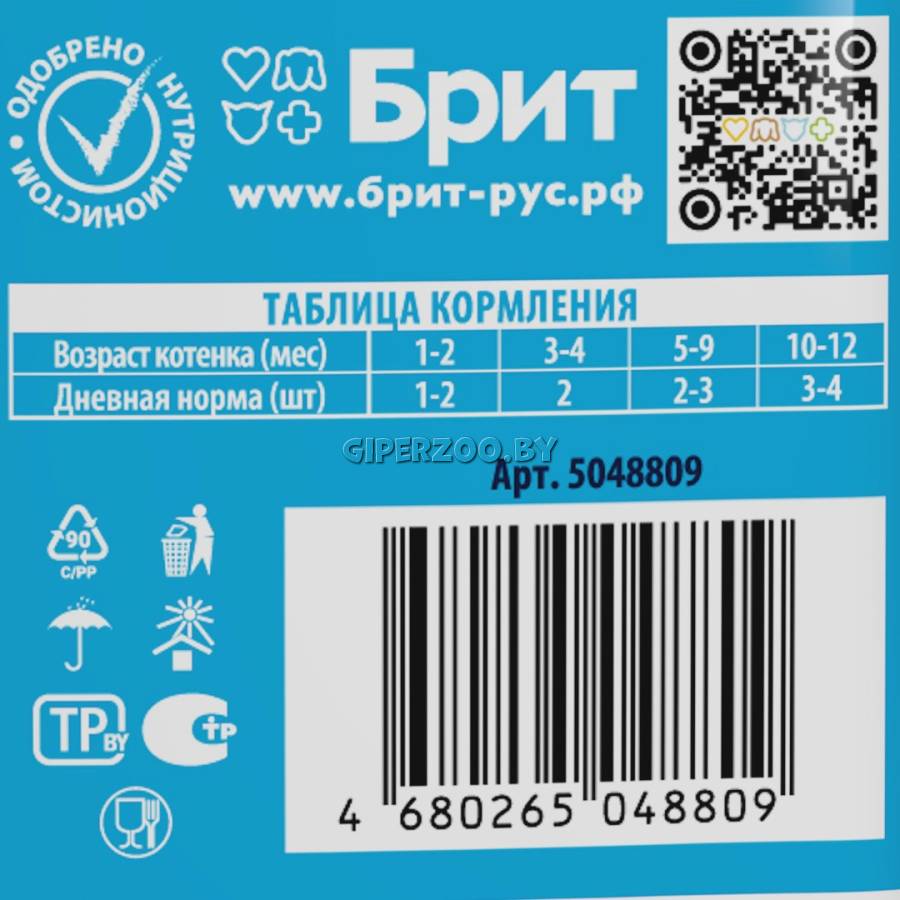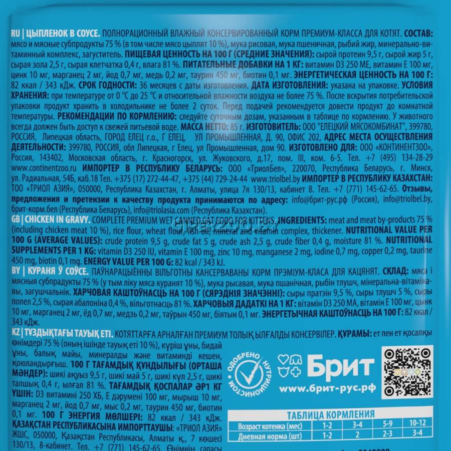 Добавки: Витамин D3 250 МЕ, витамин Е 100 мг, цинк 10 мг, марганец 2 мг, йод 0,7 мг, медь 0,2 мг, таурин 450 мг, биотин 0,1 мг. Аналитический сырой протеин 9,5 г, сырой жир 5 г, сырая зола 2,5 г, сырая клетчатка 0,4 г, влага 81%.