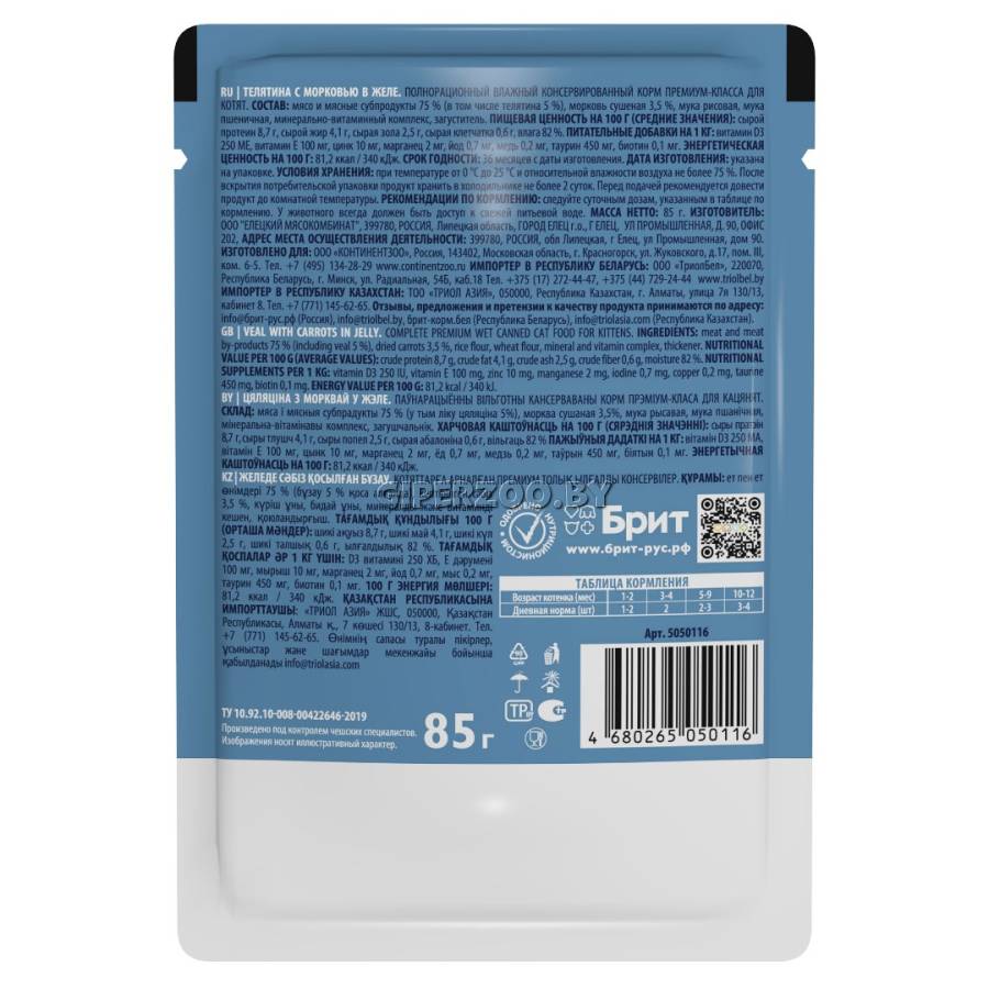Брит Премиум Пауч для котят с телятиной и морковью в желе Cat Kitten (Brit Premium) - полнорационный влажный корм премиум класса для котят. Нежные кусочки телятины с сочной морковью в аппетитном желе - идеальное сочетание для полноценного и сбалансированного рациона.