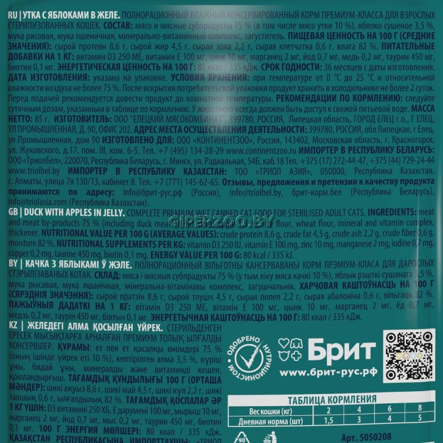 Брит Премиум Пауч для взрослых стерилизованных кошек с уткой с яблоками в желе Cat Sterilised (Brit Premium) — полнорационный влажный корм.