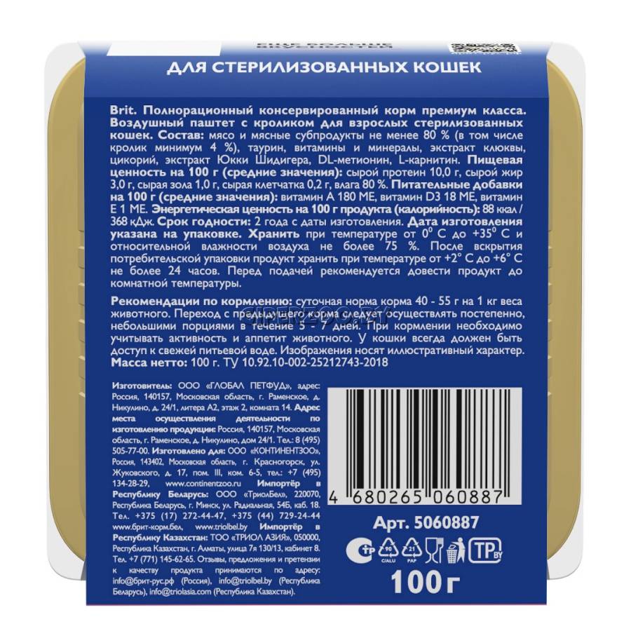 Брит Премиум Воздушный паштет для стерилизованных кошек с кроликом Cat Sterilised (Brit Premium) - влажный корм.