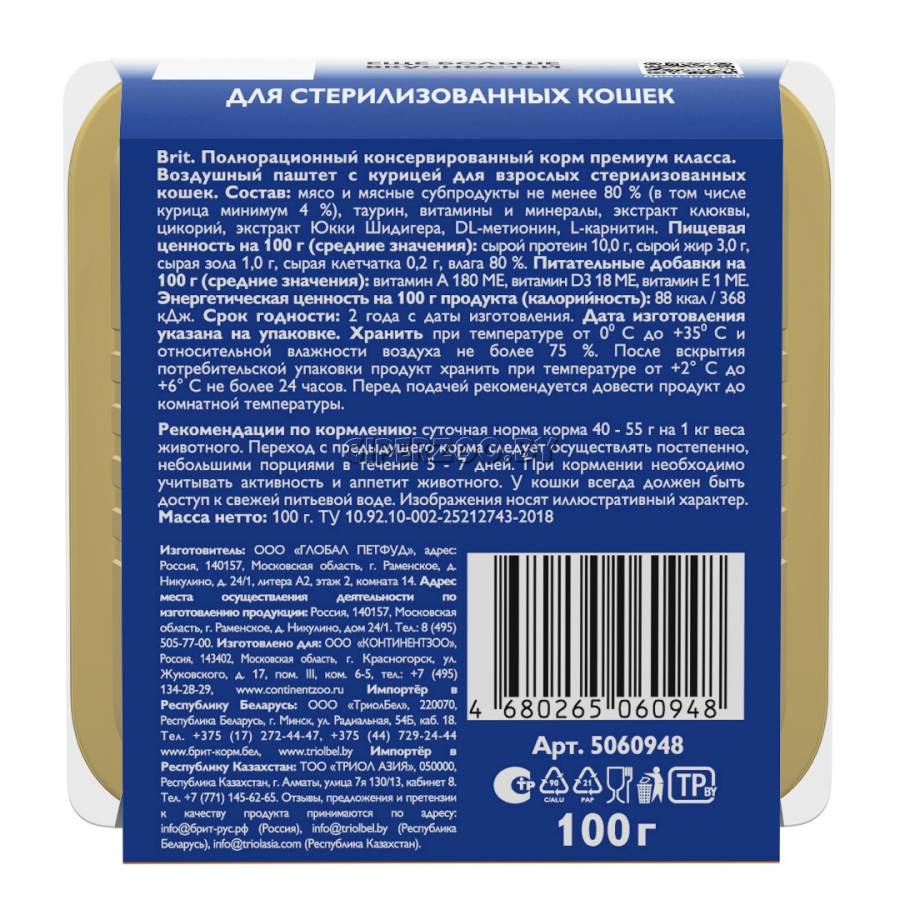 Брит Премиум Воздушный паштет для стерилизованных кошек с курицей Cat Sterilised (Brit Premium) - влажный корм.