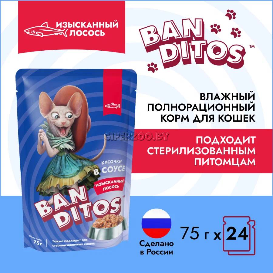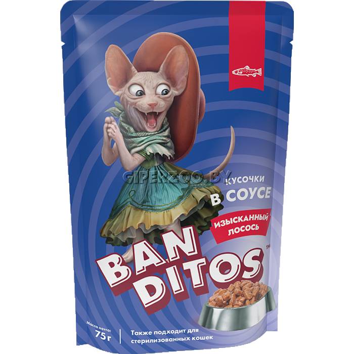 Влажный корм Banditos Adult Cat (лосось) в упаковке 75 г представляет собой полнорационный консервированный корм премиум-класса для взрослых кошек.