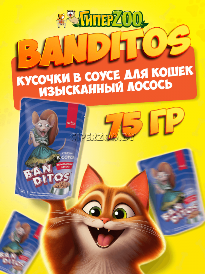 Banditos Кусочки в соусе для кошек (Изысканный лосось) — полнорационный корм консервированный с лососем, для взрослых кошек. Красная рыба богата Омега-3. Это супер-микс для шерсти, кожи и отличного расположения духа. Кусочки в соусе — для шикарных котов и роскошных кошек.