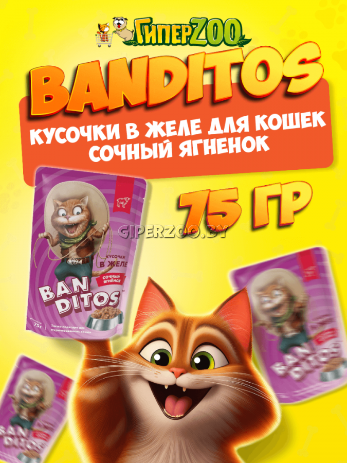 Banditos Кусочки в желе (Сочный ягненок) — полнорационный корм консервированный с ягненком, для взрослых кошек. Мясо ягнёнка — кладезь полезных веществ! Смачные и ароматные кусочки в желе — для настоящих ценителей вкуса. Для гордых котов и требовательных кошек.