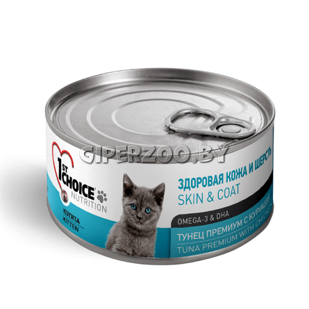 1st CHOICE Kitten Тунец премиум с курицей, 85 гр - консервы для котят тунец премиум с курицей. Это уникальное, натуральное, здоровое и функциональное дополнительное консервированное питание для котят, сделанное из высококачественного свежего мяса тунца (цельные кусочки трех видов ) и свежего мяса курицы (кусочки).