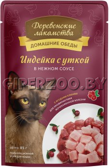 Полнорационный корм для кошек из натуральных ингредиентов, без сои, консервантов и ароматизаторов. При производстве кормов используются нежные кусочки индейки и утки с добавлением густого мясного соуса с ягодами клюквы для профилактики мочекаменной болезни.