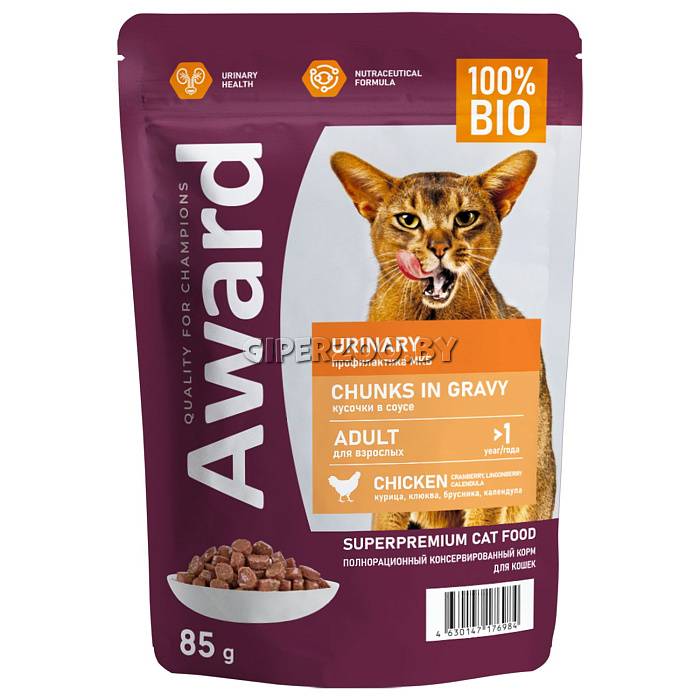 AWARD Полнорационный консервированный корм «Urinary» для профилактики мочекаменной болезни у взрослых кошек, кусочки в соусе с курицей 85 г.