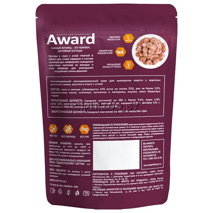 AWARD Полнорационный консервированный корм «Hairball & Indoor» для выведения шерсти у взрослых домашних кошек, кусочки в соусе с уткой 85 г.