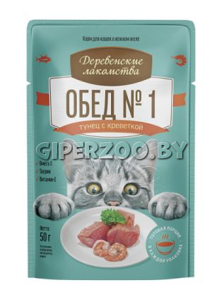 Деревенские лакомства пауч для кошек Обед№1 Тунец с креветкой - блюдо идеально сочетает насыщенные вкусы нежных креветок и тихоокеанского тунца. Подается в нежном желе. Консервы для кошек из натуральных ингредиентов, без сои, консервантов и ароматизаторов. СОСТАВ Тунец, креветка, желирующая добавка; пищевые добавки: витамин Е – 5мг-кг, рыбий жир – 5мг-кг, таурин – 5мг-кг. Пищевая ценность, %: протеин – 11, жир – 0,1, клетчатка – 1, зола – 3, влажность – 86. Энергетическая ценность в 100 г продукта: 60,93 ккал. РЕКОМЕНДАЦИИ ПО КОРМЛЕНИЮ Вес кошки 1-3кг - 1-3 пакетиков, 3-5 кг - 3-5 пакетиков. Суточная норма может варьироваться в зависимости от возраста, комплекции и уровня активности вашего питомца. Своевременно пополняйте миску свежей питьевой водой.