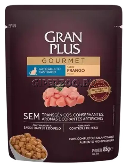 GRANPLUS CAT STERILIZED пауч для стерилизованных кошек с курицей — полноценный сбалансированный рацион для стерилизованных кошек и кастрированных котов, а также для склонных к набору избыточного веса.