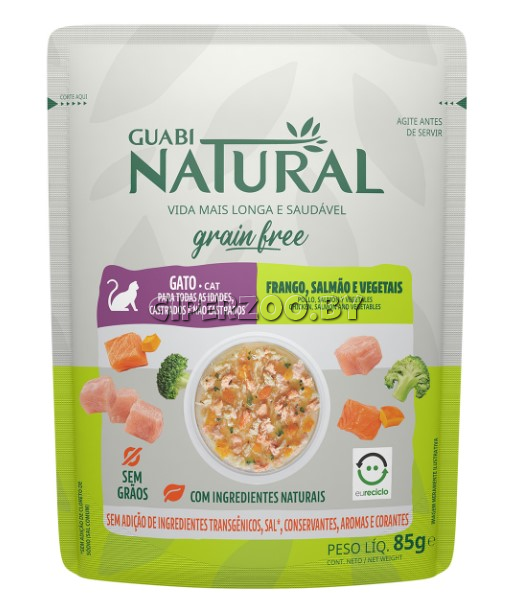 Guabi Natural Cat GRAIN FREE пауч беззерновой для взрослых кошек курица, лосось и овощи — дополнительный консервированный влажный беззерновой корм для кошек из курицы с лососем в соусе для кошек, приготовлен на пару.