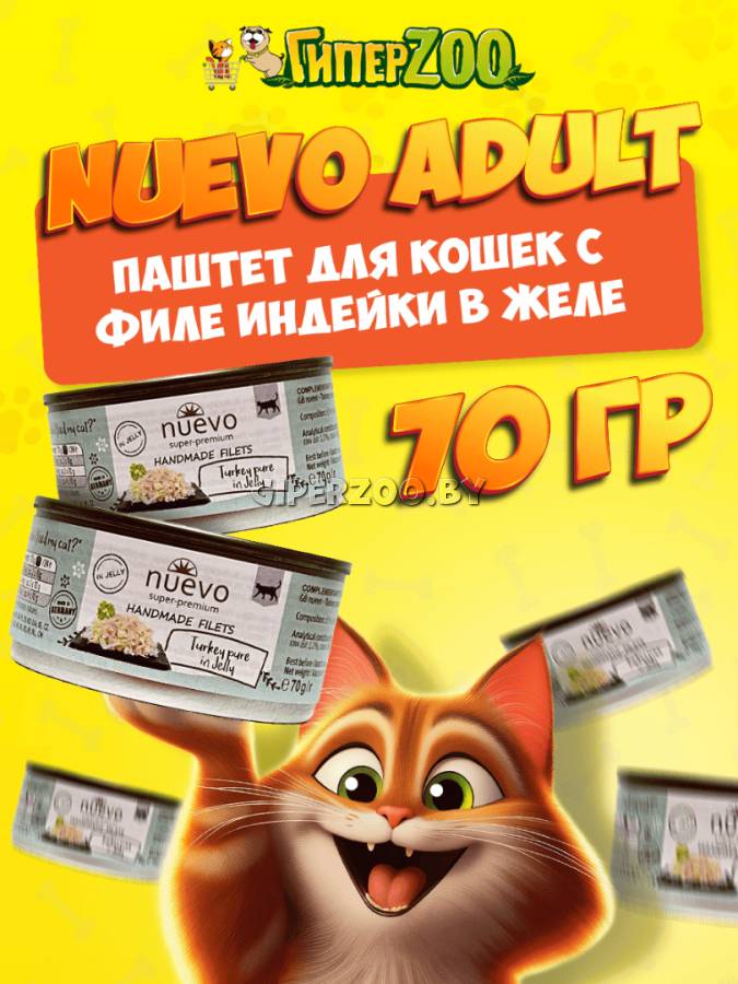 Консервы для кошек NUEVO филе индейки в желе, 70 гр – это обогащенные высококачественными питательными веществами корма, которые удовлетворят конкретные потребности вашей кошки.