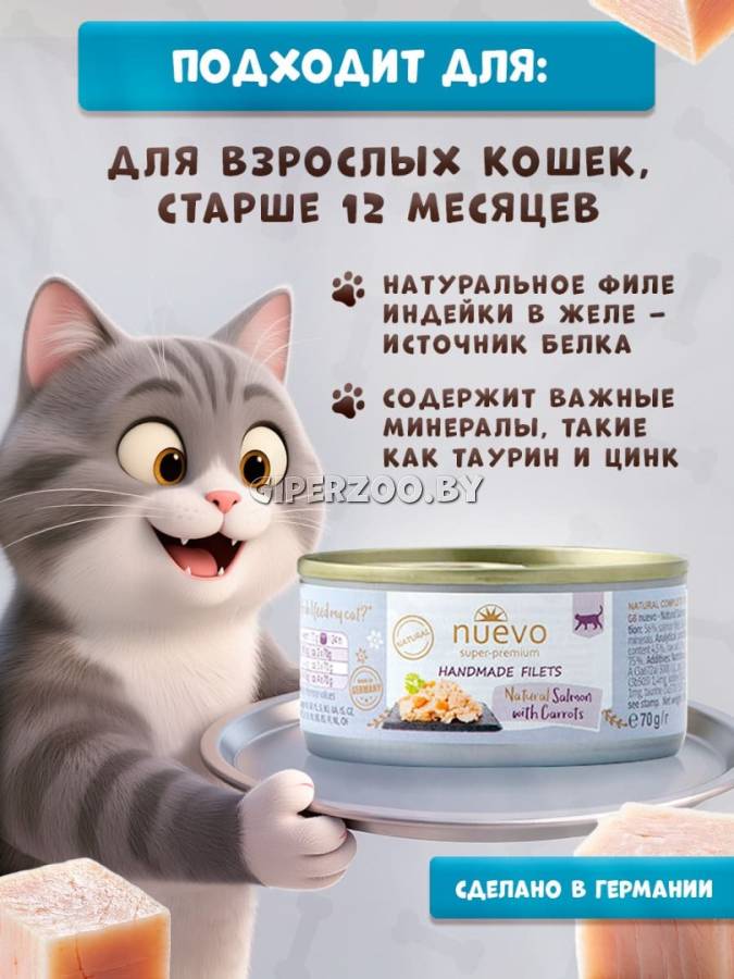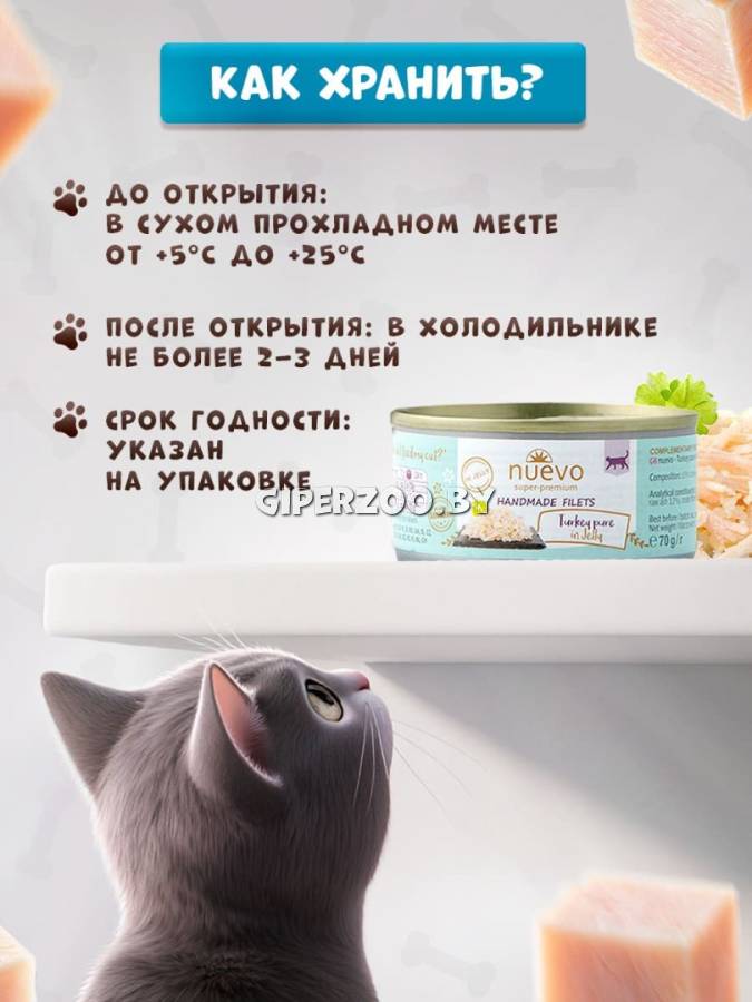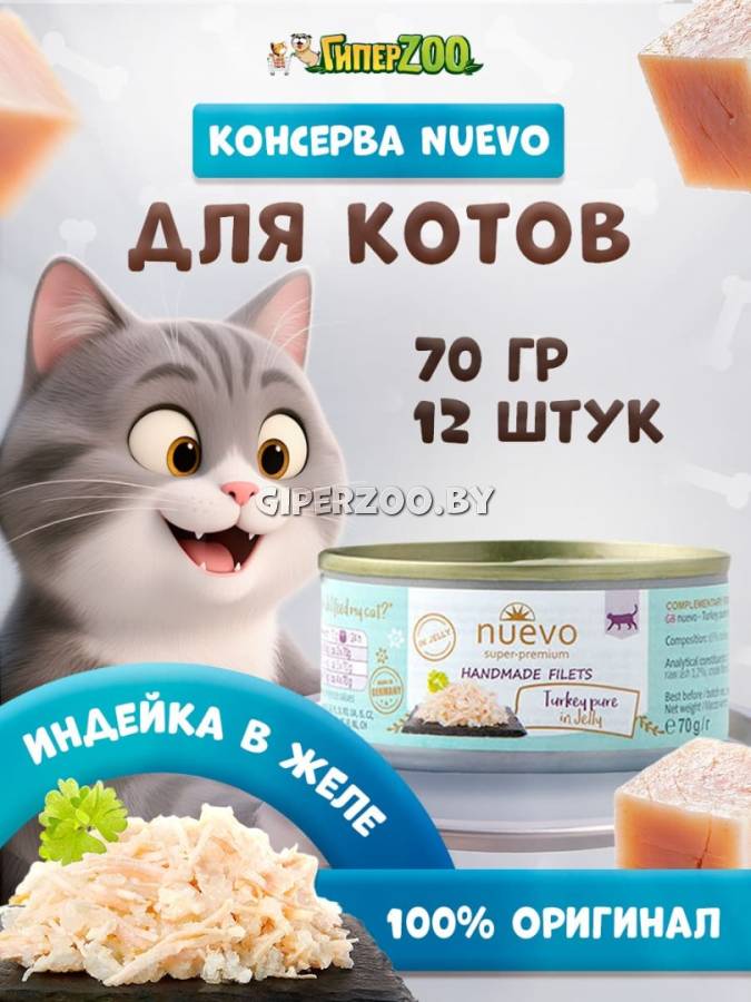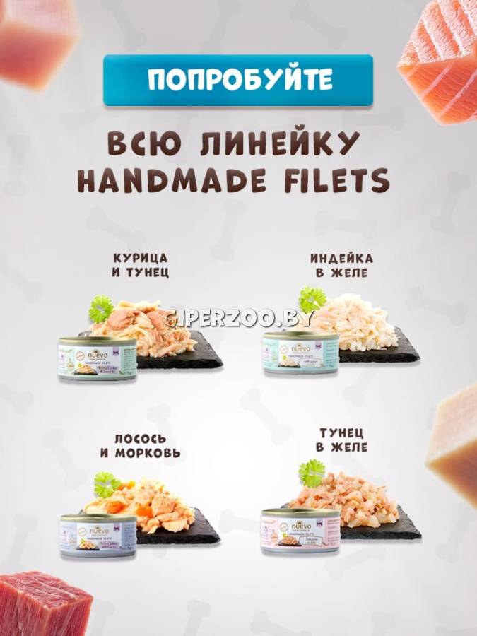 Консервы для кошек Nuevo Handmade Filets Adult Cat (индейка в желе), 70 гр*12шт – это обогащенные высококачественными питательными веществами корма, которые удовлетворят конкретные потребности вашей кошки.